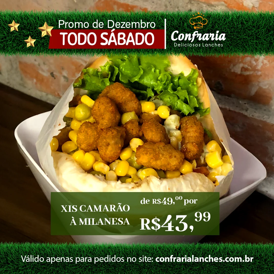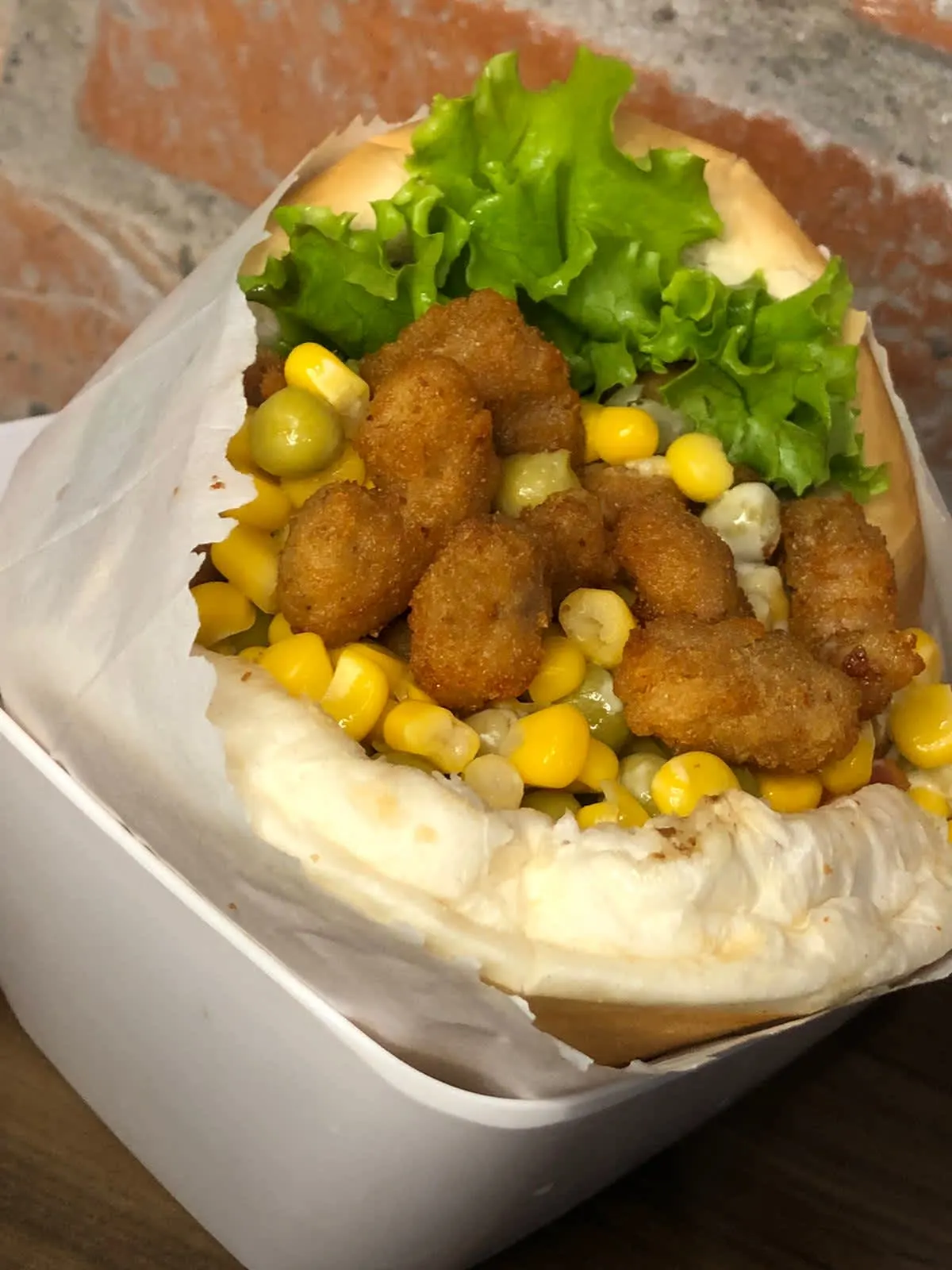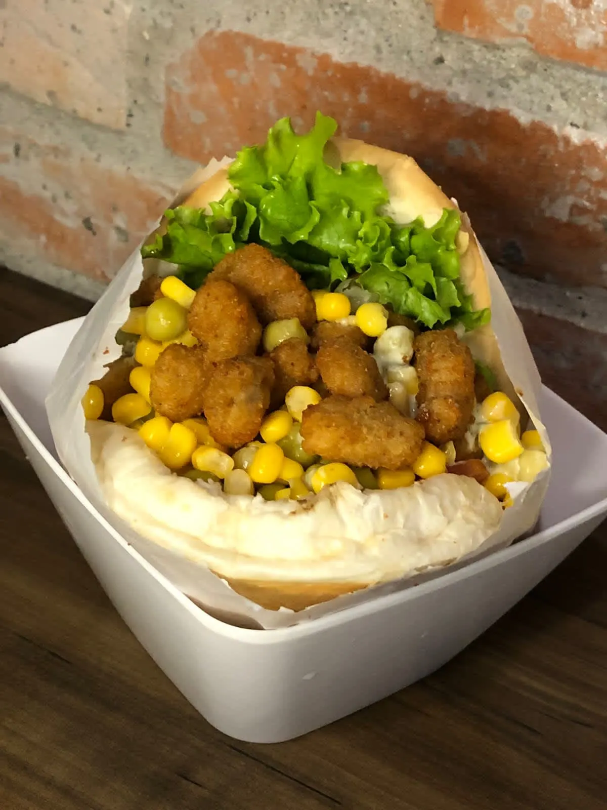 Pão, camarão a milanesa, queijo, tomate, alface, ervilha, milho e maionese.