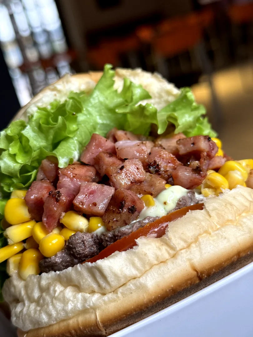 Pão, bacon, hambúrguer, queijo, presunto, tomate, alface, ervilha, milho e maionese.