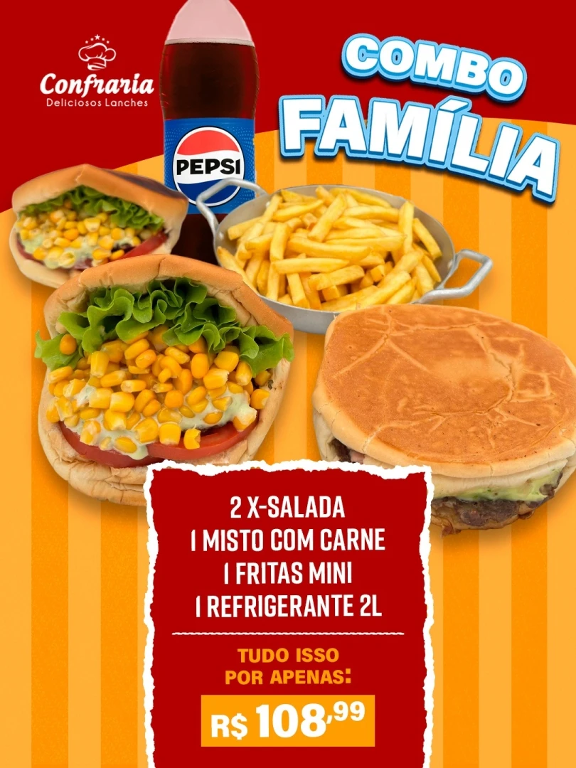 2 x-saladas, 1 misto com carne, 1 fritas mini, 1 refrigerante 2L.